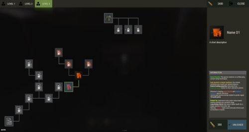 "TechTree": [ { "ID": "A2", "Parent": "A1", "Image URL or Item": { "Type": "Url", "Value": "https://imgur.com/SRGgaKX.png" }, "Grid Position": { "x": 1.0, "y": 8.0 }, "Player Info": { "Ingame Name": "Name A2", "Short Description": "A short description", "Additionnal Description": [ "<color=#32CD32><b>First info</b></color>", "<color=#FFD700>additionnal info</color>", "Warning: <color=#DC143C>a other additionnal info</color>" ] }, "Price": 300, "Curency": { "Item ID": -804769727, "Skin ID": 2816495176 }, "Rewards": [ { "Type": "ChatCommand", "Value": "say Congratulations on unlocking A2!" }, { "Type": "ConsoleCommand", "Value": "c.grant user playerID perm.use" }, { "Type": "Economics", "Value": "6500" } ] }, ], "Extra": { "Reward On All Node Unlocked": [ { "Type": "ChatCommand", "Value": "say Congratulations, you all unlocked!" }, { "Type": "Economics", "Value": "20000" } ] }