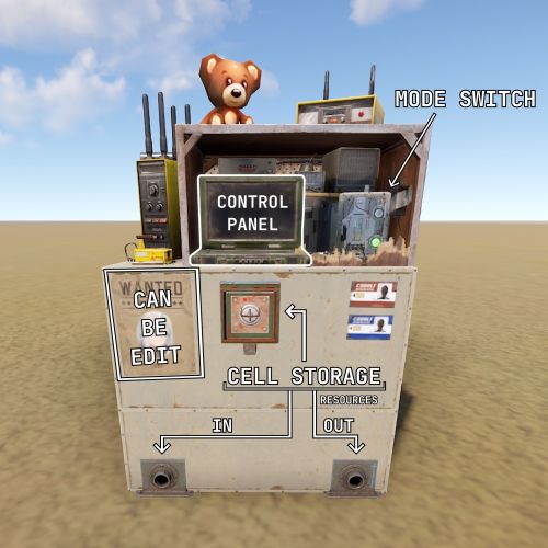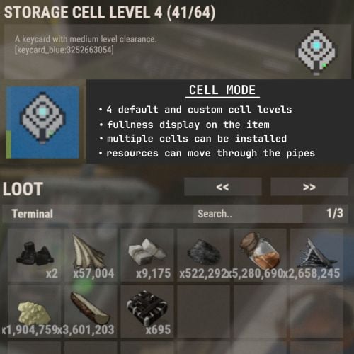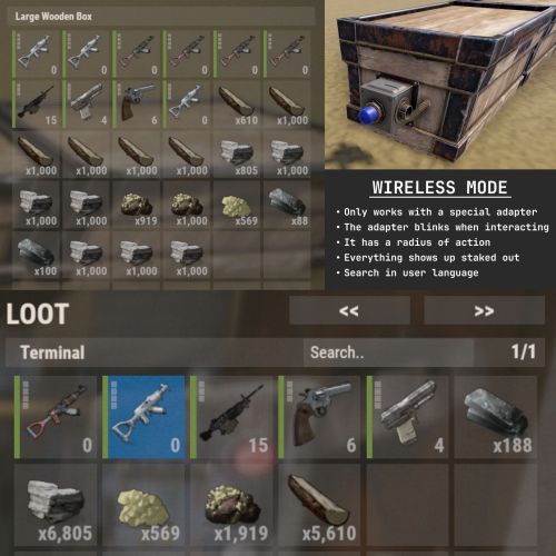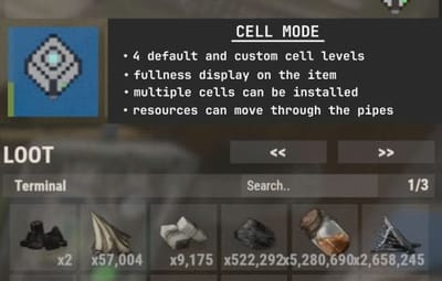 Terminal is a placeable item, with the ability to be placed both outside and in the house, serves for convenient management of all resources in the house. It has a certain amount of health (default 500), as well as the ability to pick up with a loss of strength. It has 2 modes of operation, wireless and cell, can work with industrial, by means of pipes to import and export items from cells.