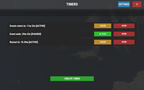 A straightforward timer plugin that displays customizable countdown timers in the game interface (top right corner). Perfect for coordinating events, announcing restarts, or managing custom countdowns. Now supoorts up to 5 timers at the same time.