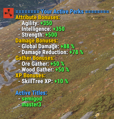 | /perks | Chat | None | Shows the player's currently active perks and titles |