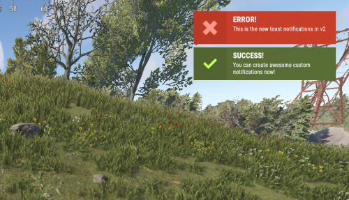 // Send a toast notification for the target player // Returns the ID of the toast to destroy it if necessary // @deprecated string SendToast(BasePlayer player, string toastId, string message, float? duration); // Use this new one instead of the above: string SendToast(BasePlayer player, string toastId, string title, string message, float? duration); // Destroy a toast notification void DestroyToast(BasePlayer player, string toastId);