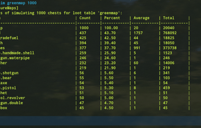 ConsoleCommand : mapsim <lootTable> <number of chests> // with this you will see in game console
