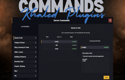 { "General": { "Open Commands": [ "cmds", "commands" ], "Rows Per Page": 6, "Close UI when prompting for input": true }, "Categories": [ { "Id": "starter", "Title": "Starter & Info", "Description": "Core commands players use immediately after joining.", "Sort Order": 0, "Required Permission (optional)": null, "Commands": [ { "Command": "/ranks", "Description": "Show player ranks.", "Benefit / Why Use It": "See your current rank and progression.", "Usage Example (optional)": "/ranks", "Required Permission (optional)": null, "Admin Only (optional)": false, "VIP Only (optional)": false, "Allow RUN (optional, override)": true, "Tags (optional)": [] }, { "Command": "/kit", "Description": "Starter kit.", "Benefit / Why Use It": "Get essential items to start playing.", "Usage Example (optional)": "/kit", "Required Permission (optional)": null, "Admin Only (optional)": false, "VIP Only (optional)": false, "Allow RUN (optional, override)": true, "Tags (optional)": [] }, { "Command": "/wear", "Description": "Change your underwear.", "Benefit / Why Use It": "Quickly change your character underwear.", "Usage Example (optional)": "/wear", "Required Permission (optional)": null, "Admin Only (optional)": false, "VIP Only (optional)": false, "Allow RUN (optional, override)": true, "Tags (optional)": [] } ] }, { "Id": "teleport", "Title": "Teleport & Home", "Description": "Teleport requests, homes, towns and utilities.", "Sort Order": 10, "Required Permission (optional)": null, "Commands": [ { "Command": "/sethome <name>", "Description": "Set home at your base.", "Benefit / Why Use It": "Save a home location for quick teleport.", "Usage Example (optional)": "/sethome main", "Required Permission (optional)": null, "Admin Only (optional)": false, "VIP Only (optional)": false, "Allow RUN (optional, override)": false, "Tags (optional)": [] }, { "Command": "tphelp", "Description": "Teleport help.", "Benefit / Why Use It": "View teleport commands and usage.", "Usage Example (optional)": "tphelp", "Required Permission (optional)": null, "Admin Only (optional)": false, "VIP Only (optional)": false, "Allow RUN (optional, override)": true, "Tags (optional)": [] }, { "Command": "/town", "Description": "Teleport to Bandit Town.", "Benefit / Why Use It": "Quick access to Bandit Town.", "Usage Example (optional)": "/town", "Required Permission (optional)": null, "Admin Only (optional)": false, "VIP Only (optional)": false, "Allow RUN (optional, override)": true, "Tags (optional)": [] }, { "Command": "/outpost", "Description": "Teleport to Outpost.", "Benefit / Why Use It": "Quick access to Outpost.", "Usage Example (optional)": "/outpost", "Required Permission (optional)": null, "Admin Only (optional)": false, "VIP Only (optional)": false, "Allow RUN (optional, override)": true, "Tags (optional)": [] }, { "Command": "/where", "Description": "Teleport to your death location.", "Benefit / Why Use It": "Return to your death spot quickly.", "Usage Example (optional)": "/where", "Required Permission (optional)": null, "Admin Only (optional)": false, "VIP Only (optional)": false, "Allow RUN (optional, override)": true, "Tags (optional)": [] }, { "Command": "/tpr <PlayerName>", "Description": "Request teleport to a player.", "Benefit / Why Use It": "Send a teleport request to another player.", "Usage Example (optional)": "/tpr Khaled", "Required Permission (optional)": null, "Admin Only (optional)": false, "VIP Only (optional)": false, "Allow RUN (optional, override)": false, "Tags (optional)": [] } ] }, { "Id": "shop", "Title": "Shop, Economy & Trade", "Description": "Server shop and purchases.", "Sort Order": 20, "Required Permission (optional)": null, "Commands": [ { "Command": "/s", "Description": "Shop.", "Benefit / Why Use It": "Open the server shop.", "Usage Example (optional)": "/s", "Required Permission (optional)": null, "Admin Only (optional)": false, "VIP Only (optional)": false, "Allow RUN (optional, override)": true, "Tags (optional)": [] }, { "Command": "/buy", "Description": "Transport license.", "Benefit / Why Use It": "Purchase transport license.", "Usage Example (optional)": "/buy", "Required Permission (optional)": null, "Admin Only (optional)": false, "VIP Only (optional)": false, "Allow RUN (optional, override)": true, "Tags (optional)": [] }, { "Command": "/buyraid", "Description": "Buy a Raidable Base.", "Benefit / Why Use It": "Purchase a raidable base event.", "Usage Example (optional)": "/buyraid", "Required Permission (optional)": null, "Admin Only (optional)": false, "VIP Only (optional)": false, "Allow RUN (optional, override)": true, "Tags (optional)": [] } ] }, { "Id": "skills", "Title": "Skills / Levels", "Description": "Leveling and skills commands (server dependent).", "Sort Order": 30, "Required Permission (optional)": null, "Commands": [ { "Command": "/st", "Description": "Open skill tree (shortcut).", "Benefit / Why Use It": "Quick access to the skill tree.", "Usage Example (optional)": "/st", "Required Permission (optional)": null, "Admin Only (optional)": false, "VIP Only (optional)": false, "Allow RUN (optional, override)": true, "Tags (optional)": [] }, { "Command": "/skills", "Description": "Open skills UI.", "Benefit / Why Use It": "View and manage your skills.", "Usage Example (optional)": "/skills", "Required Permission (optional)": null, "Admin Only (optional)": false, "VIP Only (optional)": false, "Allow RUN (optional, override)": true, "Tags (optional)": [] }, { "Command": "/skill", "Description": "Open crafting menu.", "Benefit / Why Use It": "Access crafting skill menu (if supported).", "Usage Example (optional)": "/skill", "Required Permission (optional)": null, "Admin Only (optional)": false, "VIP Only (optional)": false, "Allow RUN (optional, override)": true, "Tags (optional)": [] } ] }, { "Id": "building", "Title": "Building & Remove", "Description": "Upgrade, remove and building utilities.", "Sort Order": 40, "Required Permission (optional)": null, "Commands": [ { "Com