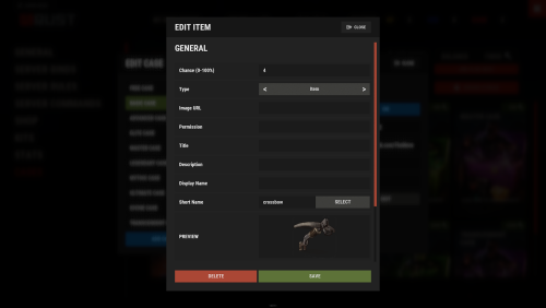 - The Item Editor will open where you can configure item type, chance, image, title, description, permissions, and all item-specific settings (weapons, contents, genes, etc.)