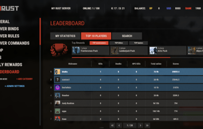- Two reward systems: post-wipe awards that give actual items, kits, and money to top players when they connect, plus an optional companion plugin UltimateLeaderboardTop for real-time privilege management based on current rankings.