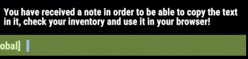 { "ReceivedNote": "You have received a note in order to be able to copy the text in it, check your inventory and use it in your browser!", "NotEnoughSpace": "You do not have enough space in your main inventory in order to receive the note, please free one slot!", "ReceivedNoteOnJoin": "Welcome! You have received a note in order to be able to copy the text in it, check your inventory and use it in your browser!", "ReceivedNoteOnRespawn": "You just respawned and received a note in order to be able to copy the text in it, check your inventory and use it in your browser!" }