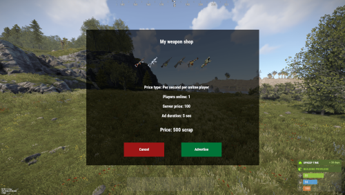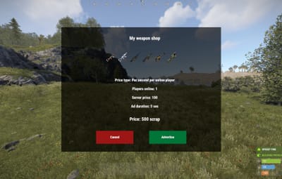 Utilizes scrap as currency for purchasing ad space, with dynamic pricing options based on advertisement duration and server population