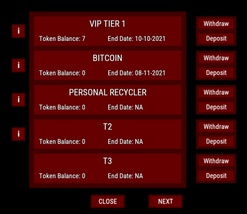 - A GUI to manage the show the players token balance, perks that each token provides, and end date of their subscription, all of which is configurable.