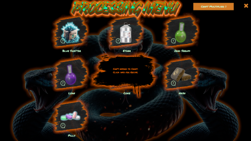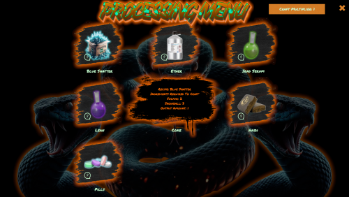 { "Multiplier Buttons": [ 1, 5, 10, 20, 50, 100, 200, 500, 1000 ], "Radius Player Needs To Be During Mix Check, Default Is 1, Try not to go too high, To Prevent Crafter Overlap": 1, "Amount of Items to give, when Spawning in Recipes and Ingredients Via Command": 100, "Base Crafter Skin": 3343180461, "Enable Base Crafter Proximity?": true, "Base Crafter Proximity The Player Needs To Be Within To Successfully Craft": 10, "Fast Crafter Skin": 3343195295, "Enable Fast Crafter Proximity?": true, "Fast Crafter Proximity The Player Needs To Be Within To Successfully Craft": 10, "Fast Crafter Small Box Skins": [ 1736652162, 1717985913, 3343194879 ], "Text Color": "0.78 1 0.82 1", "Multiplier Background Color": "0.96 0.57 0.18 0.75", "Recipe Info Image": "https://www.dropbox.com/scl/fi/rbytqsfn66u0n5ud5im27/Info.png?rlkey=tn2lmrsnvnxe49zlvbqdg5d4n&st=rjcossda&dl=1", "Stroke Image": "https://www.dropbox.com/scl/fi/2upkidj1i7myyql3862js/GlowStroke.png?rlkey=spcq15j4wlrfw452ha4t5ekfl&st=j3kxkywu&dl=1", "Banner Image": "https://www.dropbox.com/scl/fi/dbkf772yww1r0hznxvu3w/PMGLOWa.png?rlkey=n1ea7jqv3ppl528t78itwufzv&st=6smt8gtl&dl=1", "Back Button Image": "https://www.dropbox.com/scl/fi/gipwp9d59tqv1mg13ehpw/BACK.png?rlkey=isiwwk3zqri2vyy6c9dfhby80&st=aen8y3ei&dl=1", "Next Button Image": "https://www.dropbox.com/scl/fi/yl0qskx962a5pct4v8uzy/Next.png?rlkey=4pb1xt3xkkwj2bj1ol0qjuji3&st=2816qqdb&dl=1", "Navigation Buttons Color": "0.96 0.57 0.18 0.9", "Close Button Color": "0.96 0.57 0.18 0.9", "Background Image": "https://www.dropbox.com/scl/fi/69uuot1m6l49nip59zm1v/VIPER3.png?rlkey=srd9lebvdrjbkq22hatd3t28l&st=4fsfe7gx&dl=1", "Toast Image": "https://www.dropbox.com/scl/fi/vkvtxl1irp0k6f61sbun4/PopUp.png?rlkey=netyo7pjli1nhx91vwv8d88cv&st=ta5l9mzc&dl=1", "Mini Toast Image": "https://www.dropbox.com/scl/fi/5crdhycyfsrd0jrkjxne2/miniGlow.png?rlkey=t39dav111edarg9eqzx6repak&st=7838j609&dl=1", "Recipes": [ { "RecipeName": "Blue Shatter", "RecipeDescription": "Blue Shatter", "RecipeImageUrl": "", "Ingredients": [ { "IngredientCustomName": "Sulfur", "IngredientShortname": "sulfur", "RequiredAmount": 2, "IngredientSkinID": 0 }, { "IngredientCustomName": "Snowball", "IngredientShortname": "snowball", "RequiredAmount": 3, "IngredientSkinID": 0 } ], "OutputItemSkinID": 3215916045, "OutputItemShortname": "glue", "OutputItemAmount": 1, "RecipeCraftTime": 3 }, { "RecipeName": "Ether", "RecipeDescription": "Ether", "RecipeImageUrl": "", "Ingredients": [ { "IngredientCustomName": "Sulfur", "IngredientShortname": "sulfur", "RequiredAmount": 2, "IngredientSkinID": 0 }, { "IngredientCustomName": "Snowball", "IngredientShortname": "snowball", "RequiredAmount": 3, "IngredientSkinID": 0 } ], "OutputItemSkinID": 2980167987, "OutputItemShortname": "glue", "OutputItemAmount": 1, "RecipeCraftTime": 3 }, { "RecipeName": "Irad Serum", "RecipeDescription": "Irad Serum", "RecipeImageUrl": "", "Ingredients": [ { "IngredientCustomName": "Super Serum", "IngredientShortname": "supertea", "RequiredAmount": 2, "IngredientSkinID": 0 }, { "IngredientCustomName": "Snowball", "IngredientShortname": "snowball", "RequiredAmount": 3, "IngredientSkinID": 0 } ], "OutputItemSkinID": 3027539800, "OutputItemShortname": "glue", "OutputItemAmount": 1, "RecipeCraftTime": 3 }, { "RecipeName": "Lean", "RecipeDescription": "Lean", "RecipeImageUrl": "", "Ingredients": [ { "IngredientCustomName": "Super Serum", "IngredientShortname": "supertea", "RequiredAmount": 2, "IngredientSkinID": 0 }, { "IngredientCustomName": "Snowball", "IngredientShortname": "snowball", "RequiredAmount": 6, "IngredientSkinID": 0 } ], "OutputItemSkinID": 3027539845, "OutputItemShortname": "glue", "OutputItemAmount": 1, "RecipeCraftTime": 3 }, { "RecipeName": "Coke", "RecipeDescription": "Coke", "RecipeImageUrl": "", "Ingredients": [ { "IngredientCustomName": "Cloth", "IngredientShortname": "cloth", "RequiredAmount": 2, "IngredientSkinID": 0 }, { "IngredientCustomName": "Snowball", "IngredientShortname": "snowball", "RequiredAmount": 6, "IngredientSkinID": 0 } ], "OutputItemSkinID": 3027243010, "OutputItemShortname": "glue", "OutputItemAmount": 1, "RecipeCraftTime": 3 }, { "RecipeName": "Hash", "RecipeDescription": "Hash", "RecipeImageUrl": "", "Ingredients": [ { "IngredientCustomName": "Cloth", "IngredientShortname": "cloth", "RequiredAmount": 2, "IngredientSkinID": 0 }, { "IngredientCustomName": "Wood", "IngredientShortname": "wood", "RequiredAmount": 6, "IngredientSkinID": 0 } ], "OutputItemSkinID": 2961371625, "OutputItemShortname": "glue", "OutputItemAmount": 1, "RecipeCraftTime": 3 }, { "RecipeName": "Pills", "RecipeDescription": "Pills", "RecipeImageUrl": "", "Ingredients": [ { "IngredientCustomName": "Cloth", "IngredientShortname": "cloth", "RequiredAmount": 2, "IngredientSkinID": 0 }, { "IngredientCustomName": "Sulfur", "IngredientShortname": "sulfur", "RequiredAmount": 6, "IngredientSkinID": 0 } ], "OutputItemSkinID": 3027373420, "OutputItemShortname": "glue", "OutputItemAmount": 1, "RecipeCraftTime": 3 } ] }