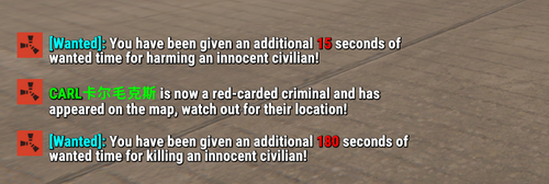 - Players who are Red Card Wanted (with a wanted time greater than 3 minutes) will appear on the map, and all players can see them. Players are encouraged to go and execute these wanted players on sight.