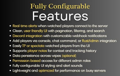 Watchlist is a lightweight but powerful tool that alerts admins when specific players connect to the server. Whether you're online or offline, you'll get real-time in-game notifications and Discord alerts with fully configurable message templates and role pings. The built-in UI makes managing the watchlist easy, with support for sorting, filtering, teleporting, and note-taking. Players can be added or removed manually or straight from RustAdmin with custom commands. Very useful tool to keep you and your staff one step ahead.