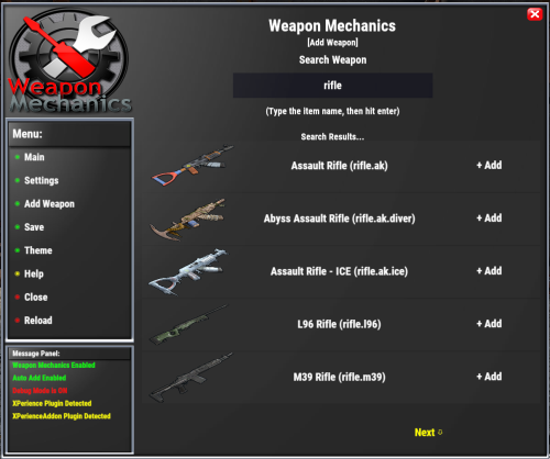 // Looks for weapon shortname as string - returns true or false if weapon is listed in Weapon Mechanics public bool IsWeaponListed(string weapon) // Looks for weapon shortname as string - returns true or false if weapon is set to unbreakable public bool IsWeaponBreakable(string weapon) // Looks for weapon shortname and attribute name as string - returns new values as floats public float WMGetWeaponData(string weapon, string value) // Looks for weapon shortname as string - returns new max ammo as int public int WMGetMaxAmmo(string weapon)