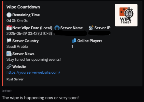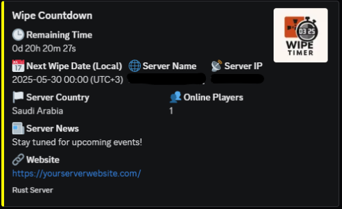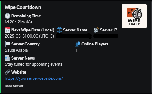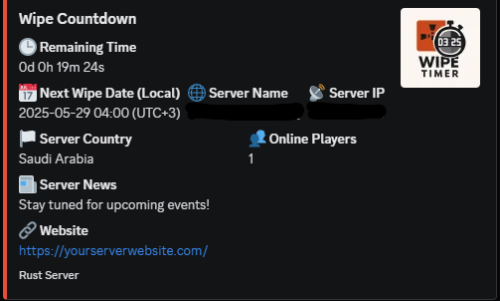 Wipe Timer is a premium Rust plugin that displays a continuously updating wipe countdown inside a dedicated Discord channel using a Discord Bot.