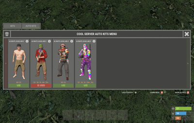 bool API_SetPlayerKit(BasePlayer player, string setKitName) - set the kit to player. [ The player inventory will be cleared. ] bool IsAutoKit(string kitName) - check if a kit exists. double GetKitCooldown(string kitName) - get kit CoolDown. (sec.) double GetDeleteKitUnixDate(string kitName) - get date of kit deletion. (Unix-time) string GetKitImageURL(string kitName) - get link to the image of the kit. string GetKitPermission(string kitName) - get permission of the kit. void PlayerTimerRemove(BasePlayer player) - remove player from UI update timer. (Useful for custom menu)