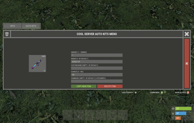 /ak, /autokit, /autokits - to open the autokits menu. [ Commands can be changed in the config. ] /autokit.admin setkit kitName - set the kit to the player, you are looking at. (Admin permission) xautokits_admin_kit_ccmd give steamID kitName seconds - give kit to a player. [ You can change the seconds and thus change the date of deleting the kit from the player. 0 - the kit will always be available to the player. seconds: 1000 or -1000. Automatically converted to Unix-time. ] xautokits_admin_kit_ccmd remove steamID kitName - remove a kit from a player. [ The kit will no longer be available to the player. ] xautokits_admin_kit_ccmd set steamID kitName - set the kit to player. [ The player inventory will be cleared. ]