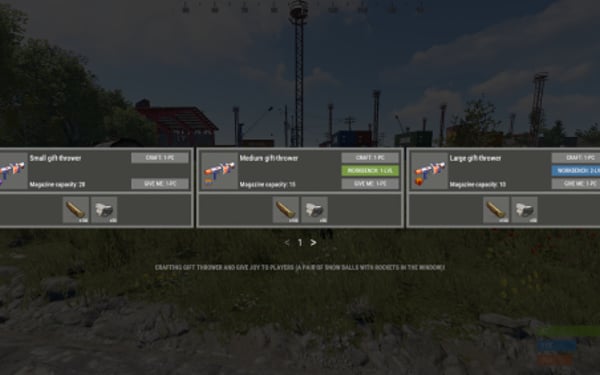 Open crafting menu - /craftgun Give out a gift-thrower - gun_give <SteamID> snowballgun <Amount> <SkinID> Give out a snowball - gun_give <SteamID> snowball <Amount>