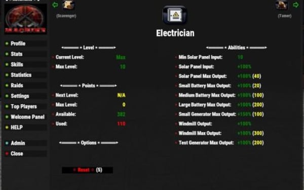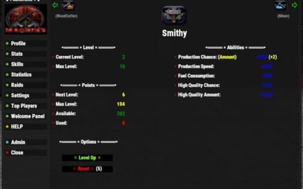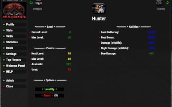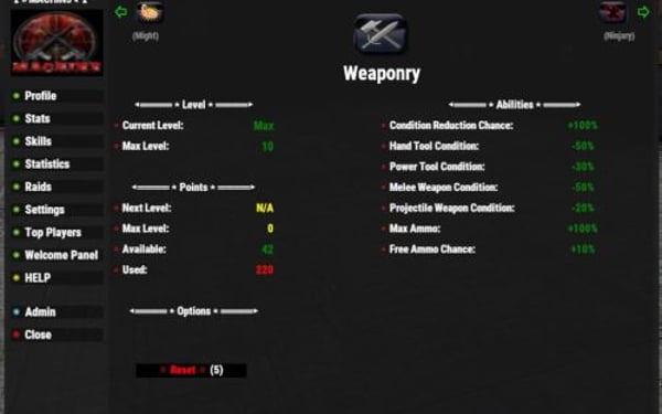 { "Player Chat Commands": { "openplayerstats": "xpstats", "showplayerstatschat": "xpstatschat", "opentopplayers": "xptop", "playeraddstat": "xpaddstat", "playeraddskill": "xpaddskill", "playerresetstats": "xpresetstats", "playerresetskills": "xpresetskills", "playerresetall": "xprestart", "playerliveuichange": "xpliveui", "openhelp": "xphelp" }, "Admin Chat Commands": { "showadminhelp": "xpadminhelp", "openadminpanel": "xpconfig", "adminresetxperience": "xpresetall", "adminxpgive": "xpgive", "adminxptake": "xptake", "adminresetplayer": "xpresetplayer", "adminfixdata": "xpfix", "adminitemchange": "itemchange" }, "Default Options": { "userpermissions": false, "liveuistatslocation": 1, "liveuistatslocationmoveable": true, "showchatprofileonconnect": true, "showunusedeffects": false, "NotifcationCooldown": 2, "restristresets": true, "resetminsstats": 60, "resetminsskills": 60, "bypassadminreset": true, "vipresetminstats": 30, "vipresetminsskills": 30, "playerfixdatatimer": 60, "disableplayerfixdata": false, "disablearmorchat": true, "hardcorenoreset": false, "allowplayersearch": true, "allowplayerreset": true, "topplayersperpage": 40, "showonlinestatus": true }, "UI Text Colors": { "defaultcolor": "white", "level": "green", "experience": "green", "nextlevel": "yellow", "remainingxp": "cyan", "statskilllevels": "green", "perks": "green", "unspentpoints": "green", "spentpoints": "red", "pets": "cyan", "mentality": "white", "dexterity": "white", "might": "white", "captaincy": "white", "woodcutter": "white", "smithy": "white", "miner": "white", "forager": "white", "hunter": "white", "fisher": "white", "crafter": "white", "framer": "white", "medic": "white", "scavenger": "white", "tamer": "white" }, "Image Icons": { "mainicon": "https://imgur.com/JUwd2a8.png", "mentality": "https://imgur.com/dR7Hcif.png", "dexterity": "https://imgur.com/u9BSoMI.png", "might": "https://imgur.com/BXCVcKb.png", "captaincy": "https://imgur.com/6y5Yha1.png", "woodcutter": "https://imgur.com/3teb5s2.png", "smithy": "https://imgur.com/uz8szzL.png", "miner": "https://imgur.com/lFkLUv0.png", "forager": "https://imgur.com/SSdZZ8O.png", "hunter": "https://imgur.com/UwASeQs.png", "fisher": "https://imgur.com/QU76hi1.png", "crafter": "https://imgur.com/IiywcbI.png", "framer": "https://imgur.com/M3VgQic.png", "medic": "https://imgur.com/mXp3Mrh.png", "scavenger": "https://imgur.com/g3S4XKW.png", "tamer": "https://imgur.com/DatpWzL.png", "chicken": "https://imgur.com/qJYzAZ6.png", "boar": "https://imgur.com/ou1DgxE.png", "stag": "https://imgur.com/CwACyuG.png", "wolf": "https://imgur.com/J18C2Je.png", "bear": "https://imgur.com/kTbD3B1.png", "online": "https://imgur.com/0ZEDsKR.png", "offline": "https://imgur.com/VAsGrpl.png" }, "UI Notify (requires UINotify plugin)": { "useuinotify": false, "disablechats": false, "xpgainloss": false, "xpgainlosstype": 0, "levelupdown": false, "levelupdowntype": 1, "dodgeblock": false, "dodgeblocktype": 2, "criticalhit": false, "criticalhittype": 3 }, "XP - Level Config": { "levelstart": 25.0, "levelmultiplier": 50.0, "maxlevel": 500, "levelxpboost": 0.05, "statpointsperlvl": 1, "skillpointsperlvl": 2 }, "XP - Night Bonus": { "Enable": true, "StartTime": 19, "EndTime": 5, "Bonus": 0.1, "enableskillboosts": true }, "XP - Gain Amounts": { "chickenxp": 5.0, "fishxp": 5.0, "boarxp": 10.0, "stagxp": 15.0, "wolfxp": 20.0, "bearxp": 25.0, "sharkxp": 30.0, "horsexp": 20.0, "scientistxp": 25.0, "dwellerxp": 25.0, "playerxp": 25.0, "lootcontainerxp": 5.0, "animalharvestxp": 5.0, "corpseharvestxp": 5.0, "underwaterlootcontainerxp": 10.0, "lockedcratexp": 25.0, "hackablecratexp": 50.0, "craftingxp": 5.0, "bradley": 25.0, "patrolhelicopter": 30.0, "playerrevive": 5.0 }, "XP - Gather Amounts": { "treexp": 5.0, "orexp": 5.0, "harvestxp": 5.0, "plantxp": 5.0, "noxptools": true }, "XP - Building Amounts": { "woodstructure": 5.0, "stonestructure": 10.0, "metalstructure": 15.0, "armoredstructure": 20.0, "buildxpdelay": true, "buildxpdelayseconds": 2 }, "XP - Teams": { "enableteamxpgain": true, "enableteamxploss": true, "teamxpgainamount": 0.1, "teamxplossamount": 0.05, "teamdistance": 50.0 }, "XP - Mission Amounts": { "missionsucceededxp": 50.0, "missionfailed": false, "missionfailedxp": 10.0 }, "XP - Reducer Amounts": { "suicidereduce": true, "suicidereduceamount": 0.05, "deathreduce": true, "deathreduceamount": 0.05 }, "BonusXP - Bonus Amounts (requires KillRecords plugin)": { "showkrbutton": false, "enablebonus": false, "requiredkills": 10, "bonusxp": 5.0, "endbonus": 500, "multibonus": true, "multibonustype": "fixed" }, "Economics Rewards (requires Economics plugin)": { "econlevelup": false, "econleveldown": false, "econresetstats": false, "econresetskills": false, "econlevelreward": 50.0, "econlevelreduction": 25.0, "econresetstatscost": 100.0, "econresetskillscost": 100.0 }, "Server Rewards (requires ServerRewards plugin)": { "srewardlevelup": false, "srewardleveldown": false, "srewardresetstats": false, "srewardresetskills": false, "srewardlevelupamt": 5, "srewardleveldownamt": 5, "srewardresetstatscost": 75, "srewardresetskillscost": 75 }, "Mentality Stat": { "maxlvl": 10, "pointcoststart": 2, "costmultiplier": 2, "researchcost": 0.1, "researchspeed": 0.1, "criticalchance": 0.05, "useotherresearchmod": false }, "Dexterity Stat": { "maxlvl": 10, "pointcoststart": 2, "costmultiplier": 2, "blockchance": 0.05, "blockamount": 0.1, "dodgechance": 0.05, "reducearmordmg": 0.05 }, "Might Stat": { "maxlvl": 10, "pointcoststart": 2, "costmultiplier": 2, "armor": 0.1, "meleedmg": 0.05, "metabolism": 0.02, "bleedreduction": 0.05, "radreduction": 0.05, "heattolerance": 0.05, "coldtolerance": 0.05 }, "Captaincy Stat": { "maxlvl": 10, "pointcoststart": 3, "costmultiplier": 3, "skillboost": 0.05, "enablexpboost": true, "xpboost": 0.05, "captaincydistance": 10.0 }, "WoodCutter Skill": { "maxlvl": 10, "pointcoststart": 2, "costmultiplier": 2, "gatherrate": 0.5, "bonusincrease": 0.1, "applechance": 0.1 }, "Smithy Skill": { "