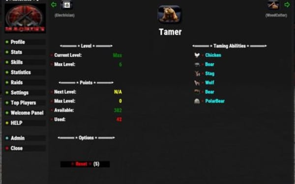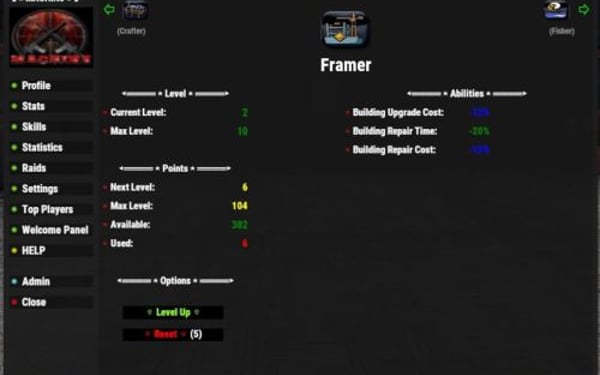 { "adminpanel": "Admin", "adminmenu_001": "Main", "adminmenu_002": "Level / XP", "adminmenu_003": "Stats", "adminmenu_004": "Skills", "adminmenu_005": "Other Settings", "adminmenu_006": "SQL", "adminmenu_007": "SAVE SETTINGS", "adminmenu_008": "Save & Reload Mod", "adminmenu_009": "CLOSE", "adminmenu_010": "Reset Default Settings", "adminmenu_011": "Fix Player Data", "adminmenu_012": "Other Mod Settings", "adminmenu_013": "Reset Options", "adminmenu_014": "My Stats", "adminmenu_015": "Player's Stats", "adminmenu_016": "Player Info", "adminitemchange": "{0} condition is now {1} and max condition is now {2}", "adminitemchangerequirement": "{0} current condition is {1} and max condition is {2}\nTo change this use /{3} (condition value) (maxcondition value)", "adminfixplayers": "All player data has been reset except experience.\nLevels, points and requirements recalculated.", "adminresetconfig": "Config has been reset to default values.", "saveconfig": "New Config has been Saved", "admininfoliveui": "Default Live UI Location", "adminxp_001": "Level & XP Settings", "adminxp_002": "[Level / Point Settings]", "adminxp_003": "Level Start:", "playerfixdata": "Your data has been fixed and your level recalculated. You will need to reapply your stat & skill points", "playerfixdatabutton": "Fix My Data", "playerharveststats": "Total Harvest Count", "playerharvestreset": "Player harvest count has been reset", "selectedplayerharvestreset": "Player {0} harvest count has been reset", "playerresetdisabled": "Player reset disabled, contact server admin", "playersearchdisabled": "Player searching is currently disabled", "imgwaiting": "Waiting On ImageLibrary to finish the load order", "resettimerdata": "Wait another {0} mins", "xphelp": "XPerience Plugin by M@CHIN3 \n Commands: \n/xpstats - brings up user control panel \n/xpstatschat - shows your level, xp, stats, and skills in chat \n/xptop - brings up top players UI \n/xpaddstats (stat) - level up selected stat \n/xpaddskill (skill) - level up selected skill \n/xpresetstats - resets all stats and refunds points \n/xpresetskills - resets all skills and refunds points \n/xpliveui (0-4) - Live UI Location / 0 = off", "xphelpadmin": "XPerience Plugin by M@CHIN3 \n Admin Commands: \n/{0} - Opens admin control panel for mod setup/{1} - resets entire mod and deletes all player data \n/{2} (playername) - resets selected player data \n/{3} (playername) (amount) - gives x amount of experience to selected player \n/{4} (playername) (amount) - takes x amount of experience from selected player \n/{5} (conditionvalue) (maxconditionvalue) - changes the item condition and max condition in your hand", "playerprofilechat": "My Stats: \n---------------- \nLevel: {0} \nCurrent XP: {1} \nNext Level: {2} \nStat Points: {3} \nSkill Points: {4} \n---------------- \nMentality: {5} \nDexterity: {6} \nMight: {7} \nCaptaincy: {8} \n---------------- \nWoodCutter: {9} \nSmithy: {10} \nMiner: {11} \nForager: {12} \nHunter: {13} \nFisher: {14} \nCrafter: {15} \nFramer: {16} \nMedic: {17} \nScavenger: {18} \nTamer: {19} \n", "suicide": "You have lost {0} XP for commiting suicide", "death": "Your XP has been reduced by {0} for death", "levelup": "You are now Level {0}. You have recieved {1} stat point and {2} skill points", "leveldown": "You have lost a level! You are now Level {0}", "statdown": "You have lost {0} stats points", "skilldown": "You have lost {0} skill points", "statdownextra": "You did not have enough unspent stat points to take, your ({0}) stat has been lowered and you have lost {1} stats points, {2} stat points returned to your unspent amount", "skilldownextra": "You did not have enough unspent skill points to take, your ({0}) skill has been lowered and you have lost {1} skill points, {2} skill points returned to your unspent amount", "bonus": "You get a bonus {0} XP for {1} {2}", "notenoughpoints": "You do not have enough points", "notenoughstatpoints": "You do not have enough points for level {0} {1}, requires {2} statpoints", "notenoughskillpoints": "You do not have enough points for level {0} {1}, requires {2} skillpoints", "pointsadded": "you now have {0} points applied in {1}", "pointsremoved": "you have remove {0} points from {1}", "statup": "You used {0} statpoints to reach Level {1} in {2}", "skillup": "You used {0} skillpoints to reach Level {1} in {2}", "nostatpoints": "You have lost all stat points", "noskillpoints": "You have lost all skill points", "resetstats": "You have reset your stats and have {0} stat points returned", "resetskills": "You have reset your skills and have {0} skill points returned", "attackerdodge": "Your victim dodged your attack", "attackerblock": "Your victim blocked {0} damage from your attack", "victimdodge": "You dodged last attack", "victimblock": "You blocked {0} damage from last attack", "crithit": "You preformed a critical hit for {0} extra damage", "weaponcon": "New weapon condition is now {0}", "medictools": "Medical Tools", "medictooluse": "You recived an extra {0} health from {1}", "medicrecoverplayer": "You have recovered with an extra {0} health.", "medicreviveplayer": "You have been revived with an extra {0} health.", "medicrevivereviver": "You have revived player with an extra {0} health.", "captaincyskillboost": "Team Skill Boost", "captaincyxpboost": "Team XP Boost", "captaincydistance": "Effective Distance", "captaincyteamrequired": "Must be part of a team!", "playerinfoalive": "Player Info Since Last Spawn:", "timealive": "Alive", "timeflying": "Flying Time", "timedriving": "Driving Time", "timeboating": "Boating Time", "timesleeping": "Sleeping Time", "timeswimming": "Swimming Time", "timeinbase": "Time In Base", "timedmgrec": "Last Dmg Recieved", "timedmgrecfrom": "Last Dmg From", "timedmgdelt": "Last Dmg Delt", "timedeltto": "Last Dmg To", "timeinmonument": "Time In Monuments", "timeinwild": "Time In Wilderness", "status": "Status", "online": "Online", "offline": "Offline", "metersran": "Meters Ran", "meterswalk":