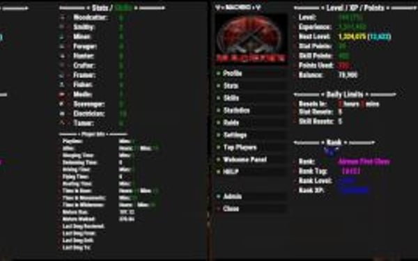 Prestige Ranks: once a player reaches max level they reset and start over with a new rank. there are 13 ranks predefined and you can change/add as many ranks as you want with name, sig(tag), and image. Ranks are disabled by default. Can adjust rank xp boosts, stat/skill boosts, points each rank starts with, extra points earned each level within a rank, and more