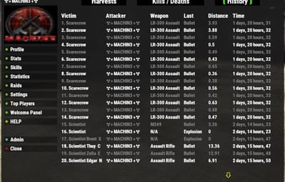 { "Welcome Panel": { "showonconnect": true, "autoclosetimer": false, "timeout": 10, "AnchorMin": ".5 .5", "AnchorMax": ".5 .5", "OffsetMin": "-300 -200", "OffsetMax": "300 200", "InsideAnchorMin": ".03 .01", "InsideAnchorMax": ".99 .97", "usebgimage": true, "usexpbgimage": true, "usemenubgimage": false, "bgfadein": 0.2, "menuwidth": 0.2, "menuheight": 0.75, "menubuttonheight": 0.07, "menubuttonfont": 11, "openwelcomepanel": "welcome", "welcomemessage": "Welcome {playername} to our server. This server has the XPerience mod installed which allows you to gain XP, Levels, and Points to spend in different Stats and Skills. Each Stat and Skill will give your character increased abilities. Check out the XP/Level Info page for more details and the Commands page for list of chat commands you can use. Click the My Profile button to view your XPerience profile and all the abilities you can earn. You can also view all the mods installed on our server by clicking the Mods Installed button.\n\nYour Level: {xp.level} \nYour XP: {xp.experience}", "showcommandsbutton": false, "showskillitemdropsbutton": true, "showcustomitemdropsbutton": true, "showprofilebutton": true, "showsettingsbutton": true, "showmodsbutton": true, "excludemods": "RustCore,UnityCore", "showadminbutton": true, "showcustombuttons": true, "showraidsbutton": true, "showspecialitemsbutton": true, "showscustompecialitems": true, "showmapbutton": true, "commands": { "0": { "command": "/xpstats", "details": "Opens your XPerience profile" }, "1": { "command": "/deaths", "details": "Opens All Death Records" }, "2": { "command": "/xphelp", "details": "Opens Help page in XPerience UI" }, "3": { "command": "/xptop", "details": "Opens Top players page in XPerience UI" }, "4": { "command": "/welcome", "details": "Opens the Welcome Panel UI" } }, "custompages": { "0": { "button": "Server Rules", "CustomSubPages": { "0": { "title": "Server Rules", "content": "Server Rules:\n\n* No Harassment, Racism, Sexism, Trolling, Disrespect, or Hate Speech!\n\n" } } } } }, "Maps": { "maxmapvotes": 2, "autoreset": false }, "Connection Info": { "serveridkey": "", "sendtorustlevels": false, "hideplayerssteam": false, "hidemodlist": false, "websitebannerurl": "", "websiteurl": "" }, "Other Features": { "usepermissions": false, "dmgbar": true, "dmgbarname": true, "dmgindicator": true, "dmgbartimeout": 10.0, "dmgbarupdate": 0.5, "dmgbarskindefault": 3, "dmgbarlocation": 35 }, "Note Messages": { "xpgain": true, "xpgainnote": 1, "levelup": true, "levelupnote": 1, "statup": true, "statupnote": 1, "skillup": true, "skillupnote": 1, "rankup": true, "rankupnote": 1, "combine": true }, "Skills": { "minerquarry": 0.1, "minerquarryduration": 120, "minerquarrycooldown": 600, "weaponryammochance": 0.01, "weaponryreload": 0.05, "weaponrydistance": 0.08, "weaponryrange": 0.04, "scavengervendingchance": 0.05, "scavengervendingamount": 0.05, "foragerrecyclerchance": 0.05, "foragerrecyclerspeed": 0.1, "medicpassivehealing": true, "medicpassivehealingcooldown": 10, "medicpassivehealingtimer": 10.0, "medicpassivehealingamount": 0.02 }, "Notify UI": { "playernotify": true, "rankup": true, "levelup": true, "statup": true, "skillup": true, "globalnotify": true, "rankupglobal": true, "levelupglobal": true, "statupglobal": true, "skillupglobal": true, "notifyuitimeout": 5.0 }, "Death Records": { "enabledeathrecords": true, "usepermissions": false, "senddeathtochat": true, "sendplayerdeathtochat": true, "senddeathtodiscord": false, "usepopupnotifications": true, "logturretkills": true, "chatfontsize": 10, "attackercolor": "#FF0000", "victimcolor": "#00FF00", "weaponcolor": "#0000FF", "distancecolor": "#00FF00", "enabledistancebonus": true, "xpbonusamount": 50, "bonusrangedistance": 25, "deathrecordschatcommand": "deaths", "discordwebhookurldeaths": "https://support.discordapp.com/hc/en-us/articles/228383668-Intro-to-Webhooks", "entityList": { "0": { "entity": "chicken", "name": "Chicken" }, "1": { "entity": "boar", "name": "Boar" }, "2": { "entity": "stag", "name": "Stag" }, "3": { "entity": "wolf", "name": "Wolf" }, "4": { "entity": "bear", "name": "Bear" }, "5": { "entity": "polarbear", "name": "Polar Bear" }, "6": { "entity": "simpleshark", "name": "Shark" }, "7": { "entity": "ridablehorse", "name": "Horse" }, "8": { "entity": "scientistnpc", "name": "Scientist" }, "9": { "entity": "tunneldweller", "name": "Tunnel Dweller" }, "10": { "entity": "underwaterdweller", "name": "Underwater Dweller" }, "11": { "entity": "scarecrownpc", "name": "Scarecrow" }, "12": { "entity": "zombienpc", "name": "Zombie" }, "13": { "entity": "customscientistnpc", "name": "Custom Scientist" }, "14": { "entity": "bradleyapc", "name": "Bradley APC" }, "15": { "entity": "patrolhelicopter", "name": "Patrol Helicopter" }, "16": { "entity": "basehelicopter", "name": "Patrol Helicopter" } } }, "Images": { "xperienceaddonlogo": "https://i.imgur.com/QSXW2vV.png", "rustlevelslogo": "https://i.imgur.com/lb2l1s5.jpg", "dmgbarimg": "https://i.imgur.com/XzoMdbI.png", "dmgbarimgname": "https://i.imgur.com/RhboH5w.png", "notifybar": "https://i.imgur.com/Cuea6lw.png", "welcomepanel": "https://i.imgur.com/JUwd2a8.png", "raideasy": "https://i.imgur.com/cAUlHlA.png", "raidmedium": "https://i.imgur.com/Tzhbic3.png", "raidhard": "https://i.imgur.com/MGNUPg0.png", "raidexpert": "https://i.imgur.com/bPql6Tz.png", "raidnightmare": "https://i.imgur.com/RpiC5dy.png", "welcomebg": "https://i.imgur.com/DdVLKsE.png", "menubg": "https://i.imgur.com/DrWCba0.jpg", "xp": "https://i.imgur.com/yAmIsSX.png", "dmgbarimgs": { "0": { "name": "DmgBar0", "url": "https://i.imgur.com/jQFs4Y1.png" }, "1": { "name": "DmgBar1", "url": "https://i.imgur.com/VGfALAA.png" }, "2": { "name": "DmgBar2", "url": "https://i.imgur.com/5RHS1wS.png" }, "3": { "name": "DmgBar3", "url": "https://i.imgur.com/t6WAKp0.png" }, "4": { "name": "DmgBar4", "url": "https://i.imgur.com/x7j4X1N.png" }, "5": { "name": "DmgBar5", "url": "https://i.imgur.com/0hCAV9y.png" }, "6": { "na