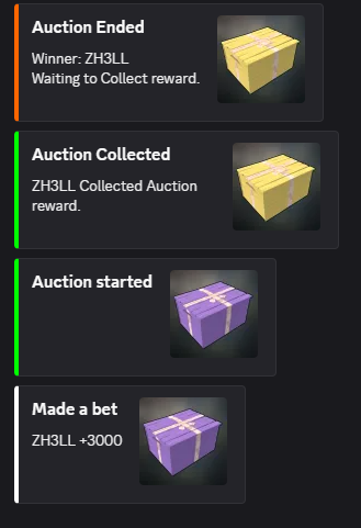 - Discord Integration: Automatically send webhook messages for auction starts, ends, new high bids, and when a winner collects their items.