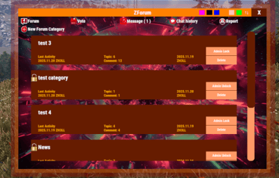 - Players can create Topics in Category if not locked (players can lock theirs Topics)