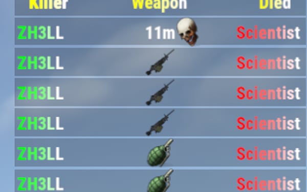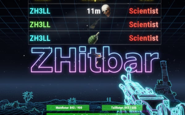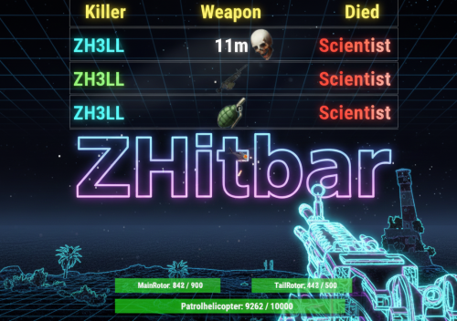 ZHitbar is an Oxide/uMod plugin for Rust servers designed to enhance the combat experience with two core features: Hitbar System: When you deal damage to an entity (player, animal, vehicle, or building block), a visual health bar appears on your screen showing the target's current and maximum health. Notably, it can also display the health of specific weak spots (rotors) for the Patrol Helicopter. Death Log: A sleek, customizable death message feed at the top of the screen. It displays the attacker, the victim, the weapon icon, and the kill distance.