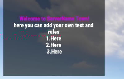 { "DisplayDuration": 10.0, "ZoneMessages": { "34929664": "<color=#cc03d6>Welcome to ServerName Town!</color>\nhere you can add your own text and \nrules \n1.Here \n2.Here \n3.Here", "zone2": "Zone 2 has strict rules. Read them carefully!" } }