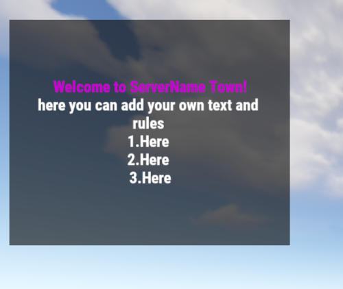 { "DisplayDuration": 10.0, "ZoneMessages": { "zone1": "<color=#cc03d6>Welcome to ServerName Town!</color>\nhere you can add your own text and \nrules \n1.Here \n2.Here \n3.Here", "zone2": "Zone 2 has strict rules. Read them carefully!" } }