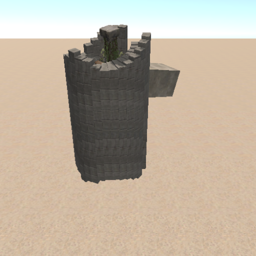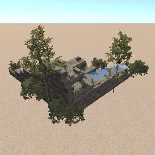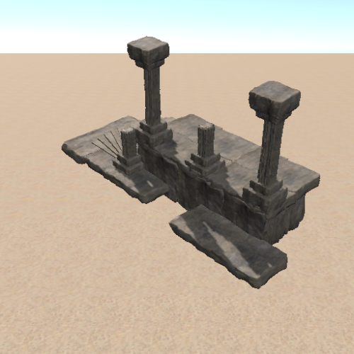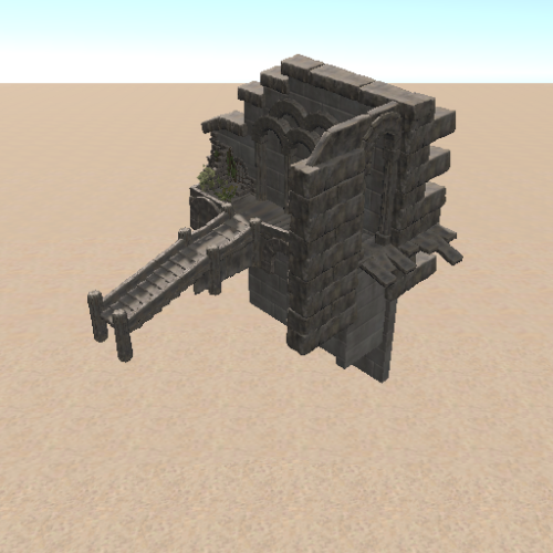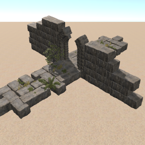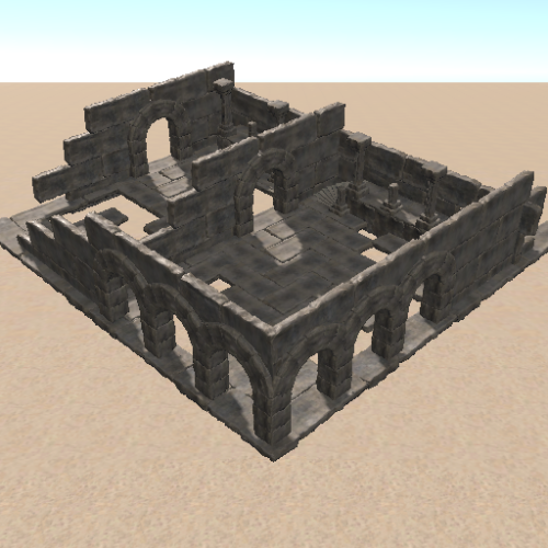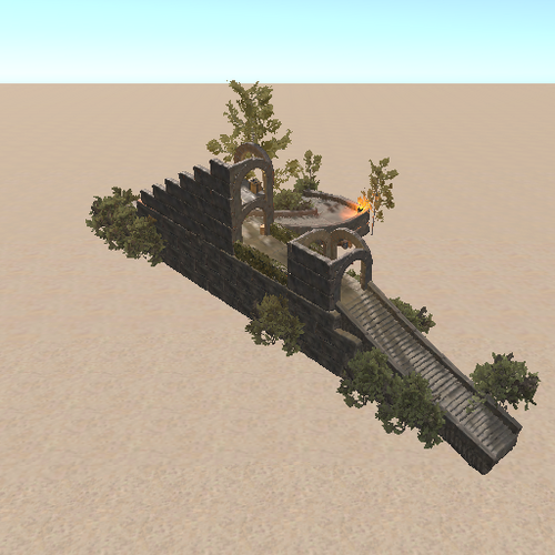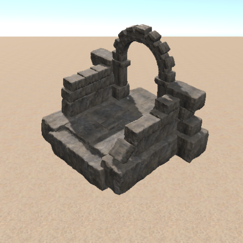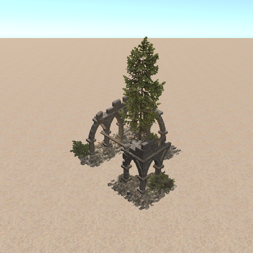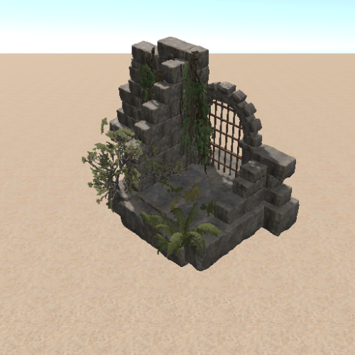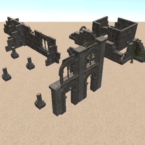 There are three doors, a spiral staircase, a cave entrance, 6 various ruins.