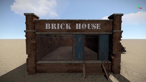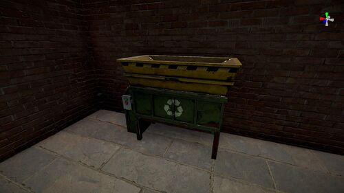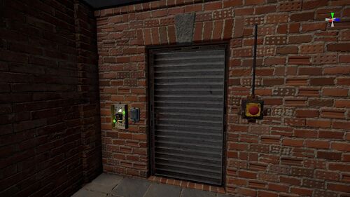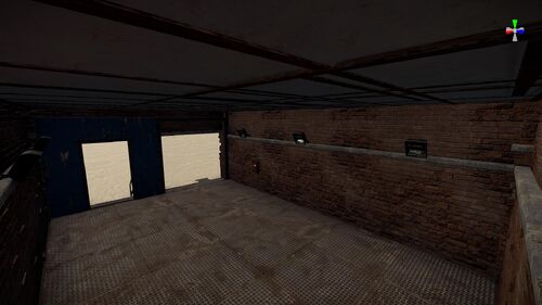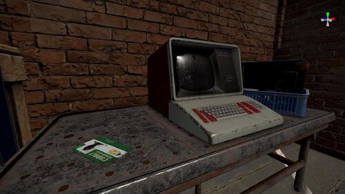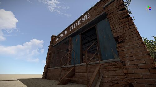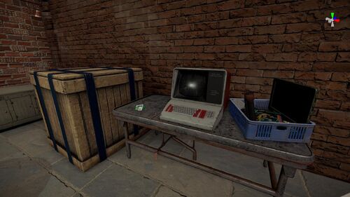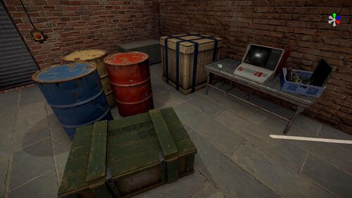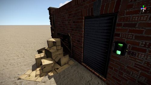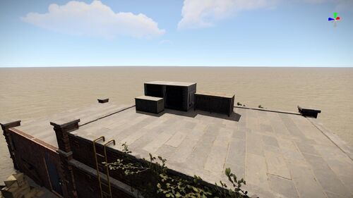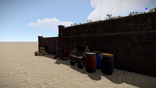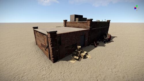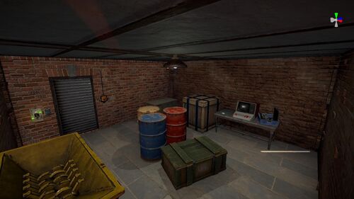 - There is a room with loot behind that requires a green access card. In this room there is a military crate that spawns with 100% probability, and a crate that can be either military or regular. In the middle there are 3 barrels, one of them is fuel. Next to them there is a table with a computer, on which a green card spawns. Opposite the table there is a recycler, to the right of which a bot spawns that spawns on the sides of the road.