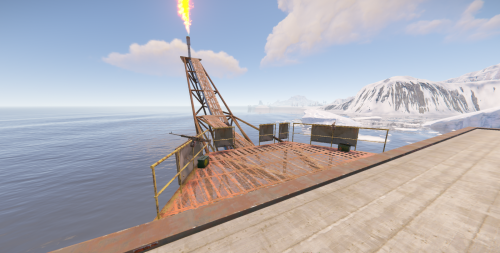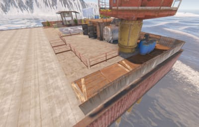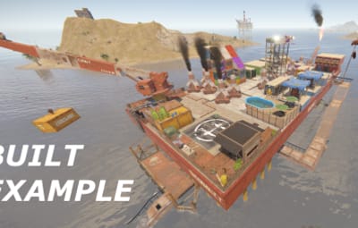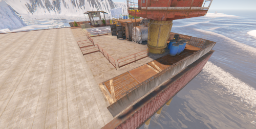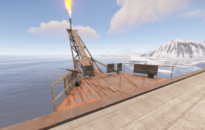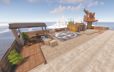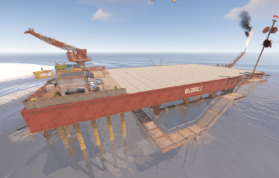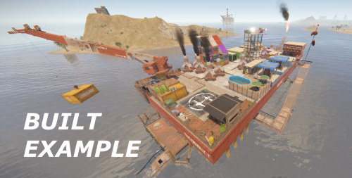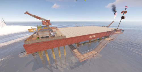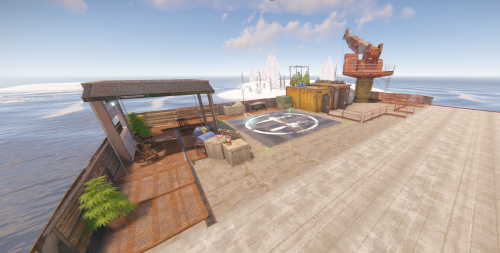 The platform has a room for free use inside and is accessible via a container entrance. At the bottom there is a 360 degree camera whose code you can change in rustedit. There is a jetty with a staircase and plenty of space to store rhibs and submarines. There is also a room with a refinery on the platform. The doors can be locked and screwed and the deco version offers amenities such as a functional radio, chairs, grill and repair bench.