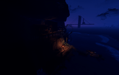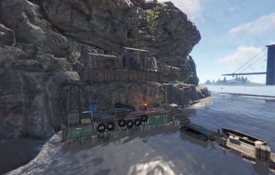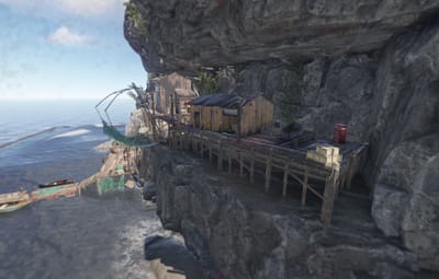 Small fishing village, 2 normal crates, 1 tool crate, a few barrels. This has no safezone, no recycler and no boat npc. has a vending machine for kayak blueprints. best used integrated into existing cliffs or contructing a cliff around it