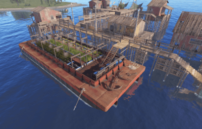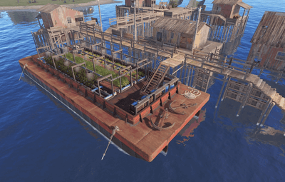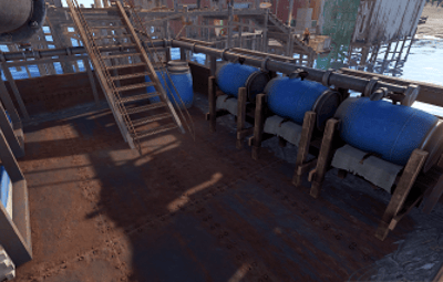 An old rusty barge converted into a utility platform with a generator room, vendor stalls, and functional farms. Fresh purified water barrels are available for all visitors.