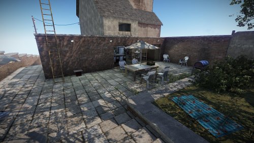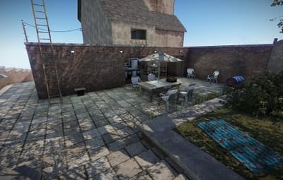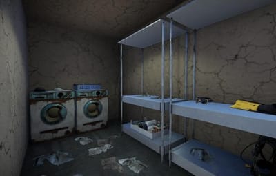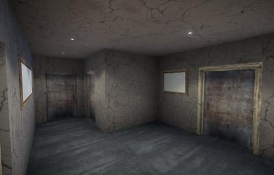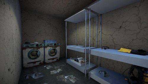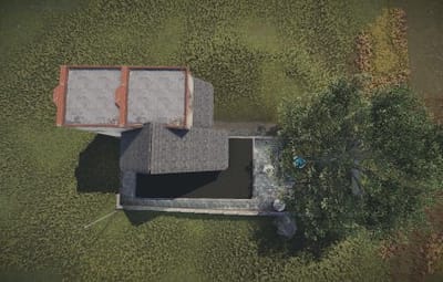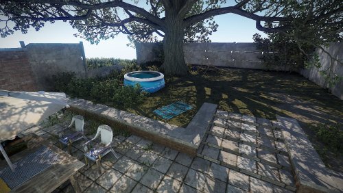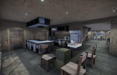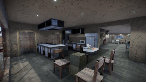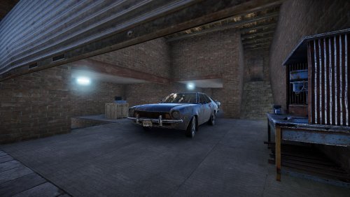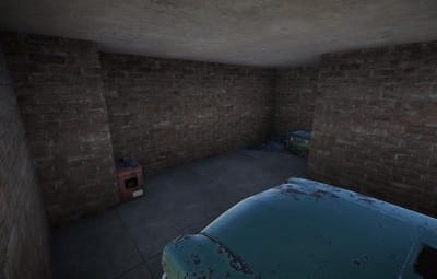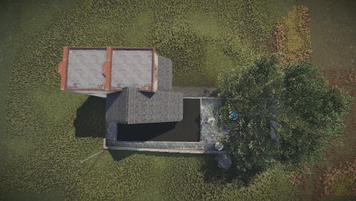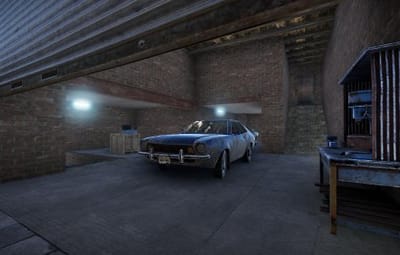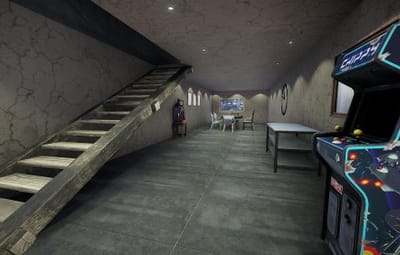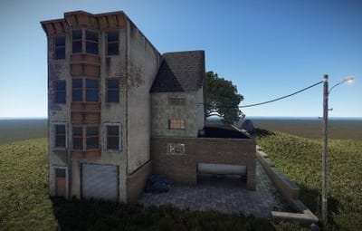 Row house with a large extension containing a garage, laundry room, Kitchen, game/dining room and bedroom.