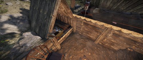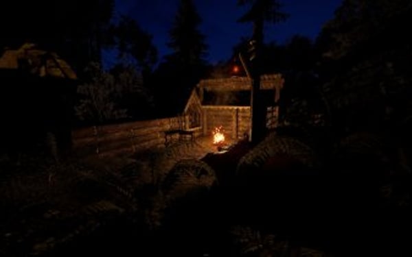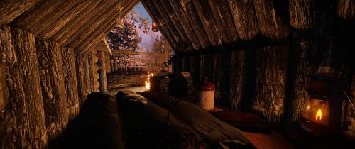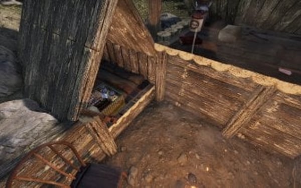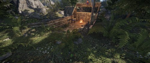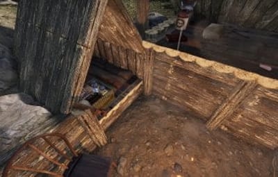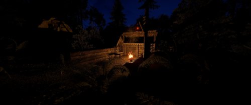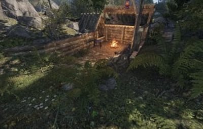 This camp has a bone fire and that can used by players and seats triggers on the chair, top bed and the dead tree. A small crate is accessible next to the lower bed.