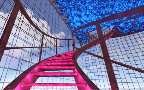 -Spiral staircase illuminated with pink lights to access the upper part.