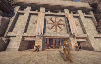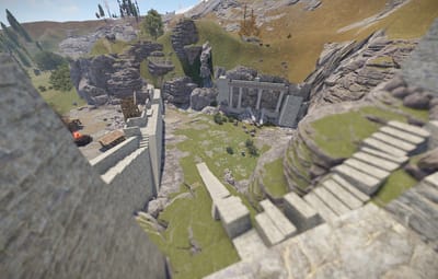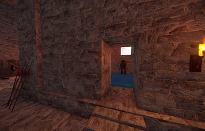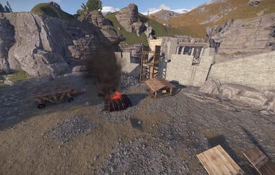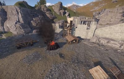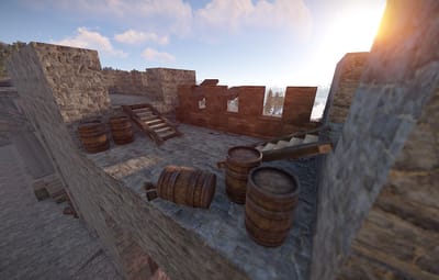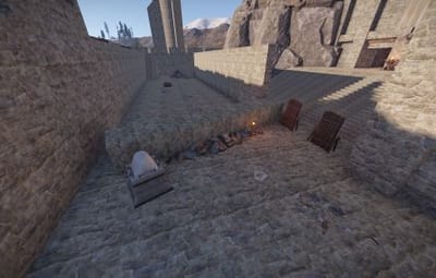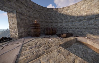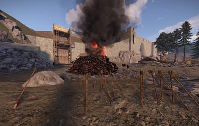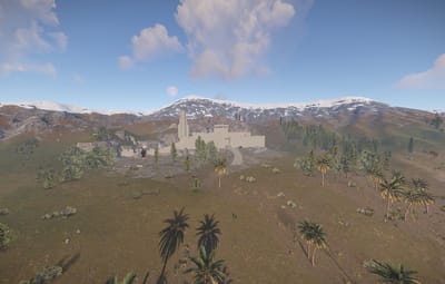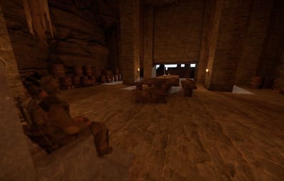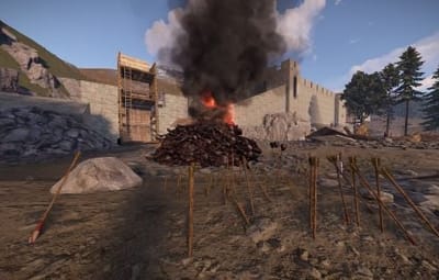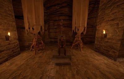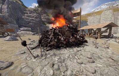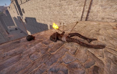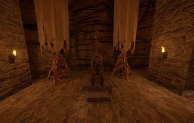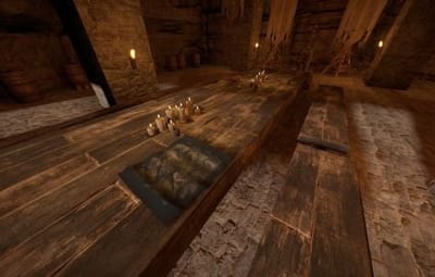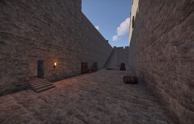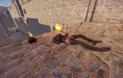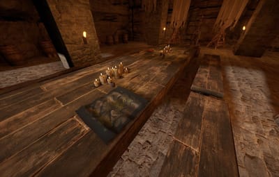The prefab has a battlefield with burning corpses. On the castle grounds, there is also a throne room with a table for meals.