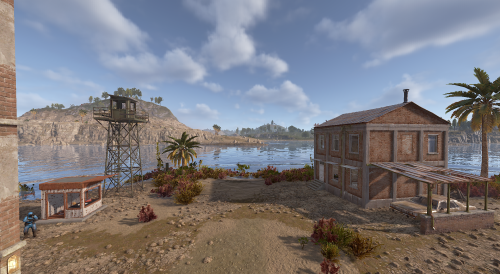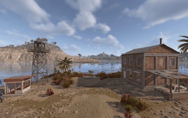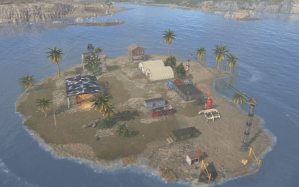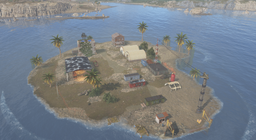 A decayed settlement that once served as a remote research or communications base. Half-collapsed buildings, makeshift shelters, and a skeleton still sitting at a desk that hint at a sudden and unexplained evacuation. The island includes multiple enterable structures, loot-friendly interior spaces, ambient lighting, and environmental storytelling. Surrounded entirely by water, it works great as a standalone monument, a side quest destination, or a secluded point of interest.