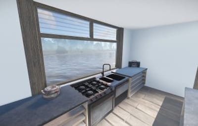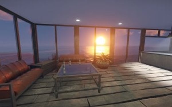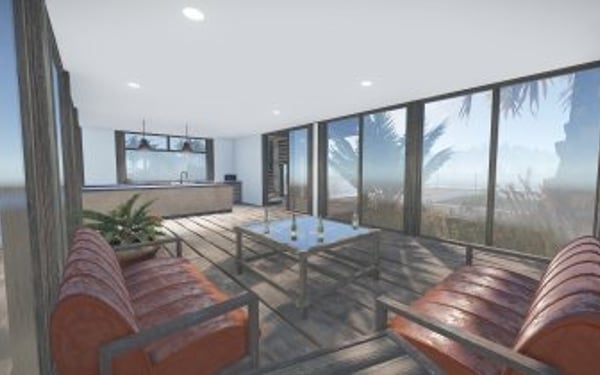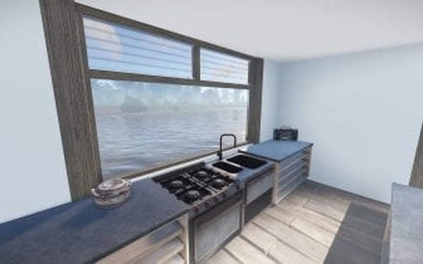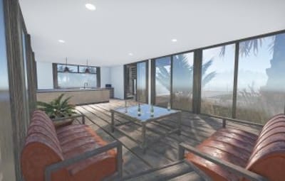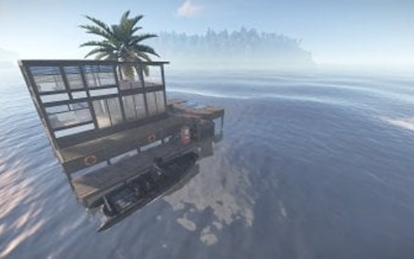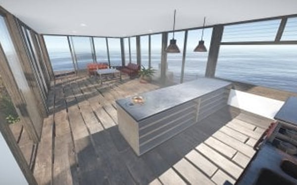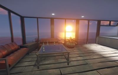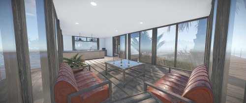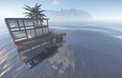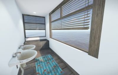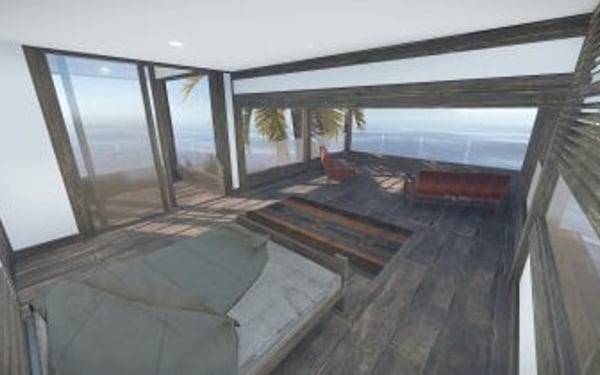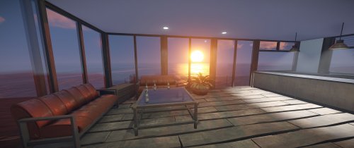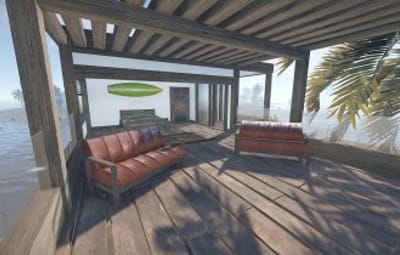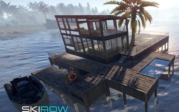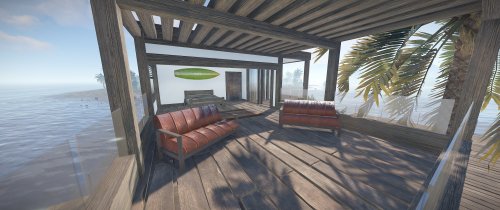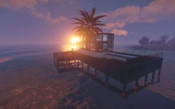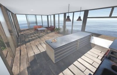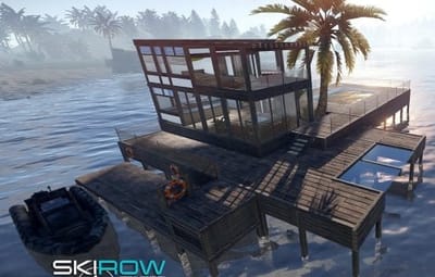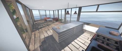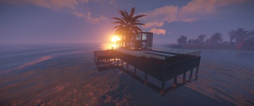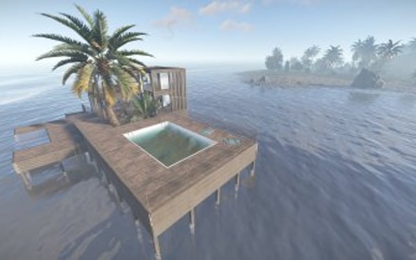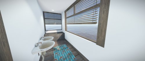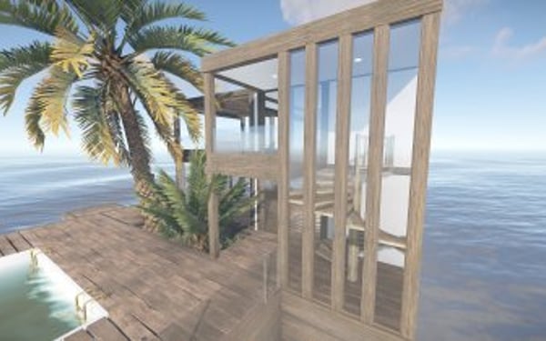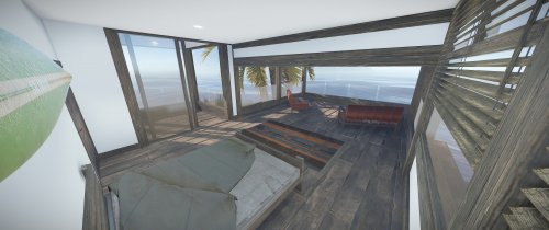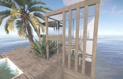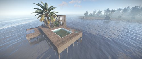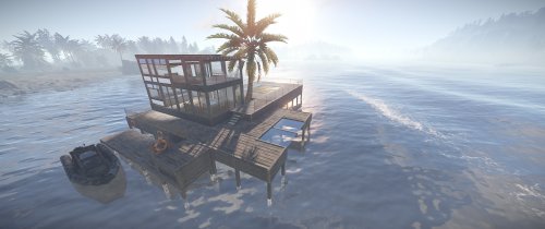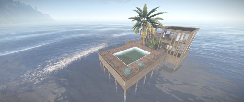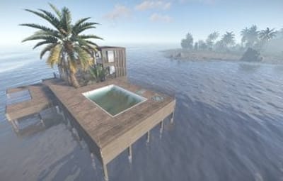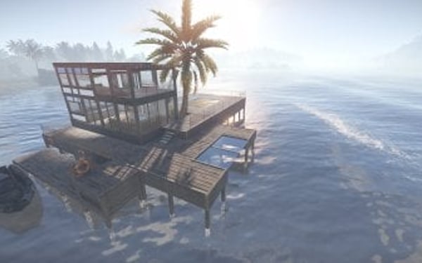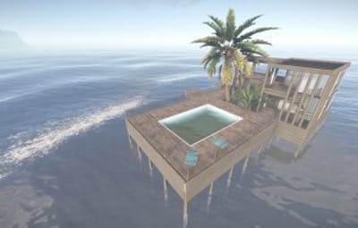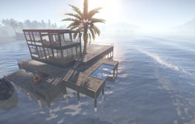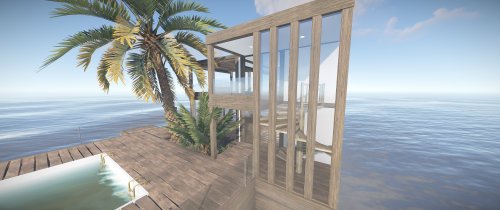 Luxury house on stilts with a modern design. This house is for those who want to get some distances from the mainland and want to enjoy the sound of the waves and bases getting raided far away. The first floor has a main room with a small kitchen. The radio on the counter works. There is also a small dock with a dingy and a pool to add more comfort. The second floor has a bedroom, bathroom and a terrace. Three small crates are slightly hidden on the dock, underneath the stairs.