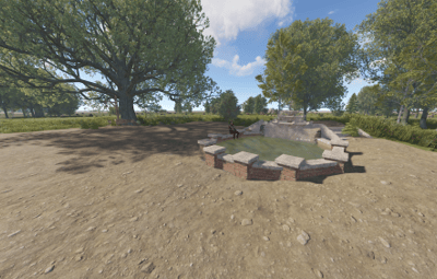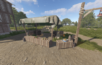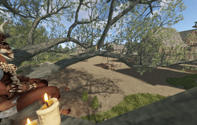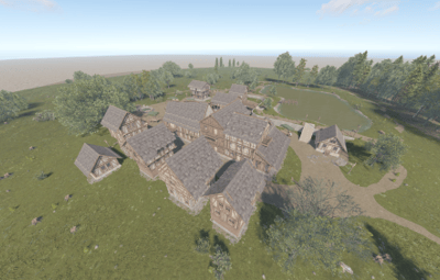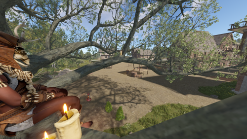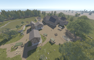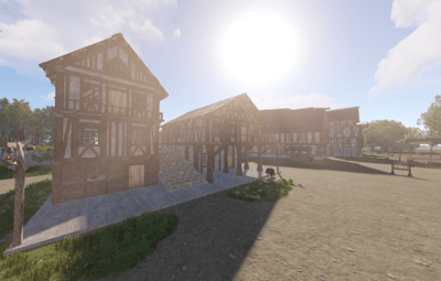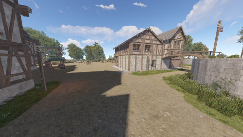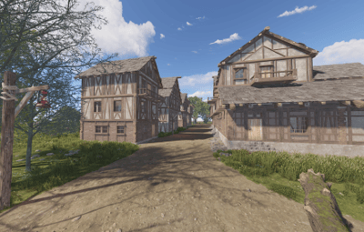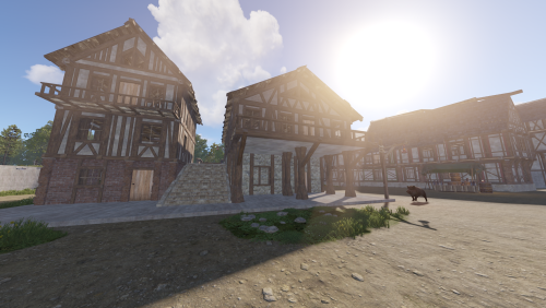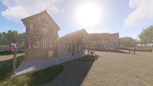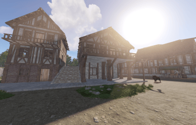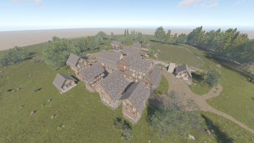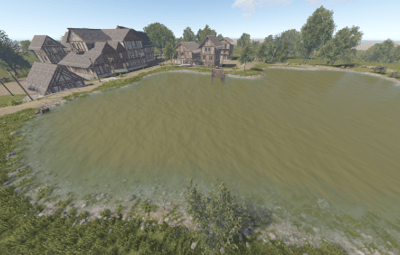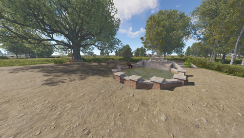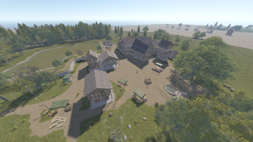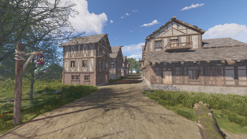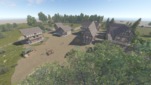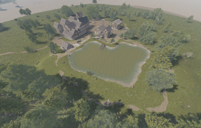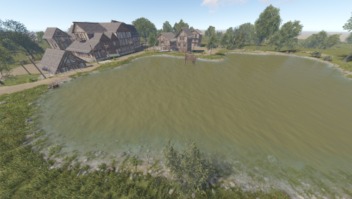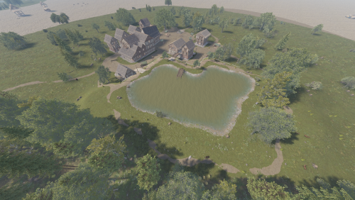 with market, fountain. lovingly designed houses, a house with a bridge to the lake, apple trees and a large tree,