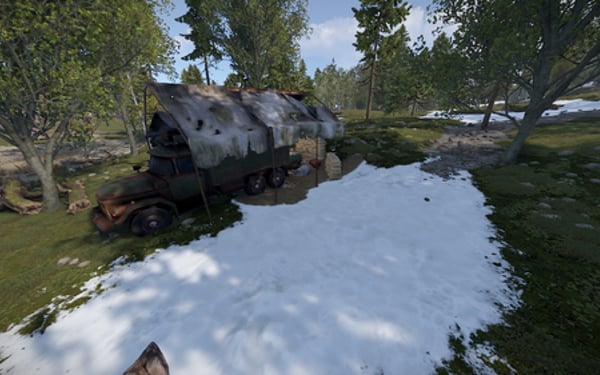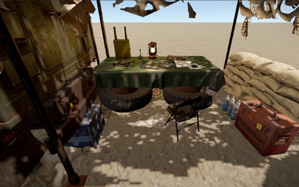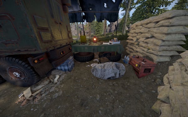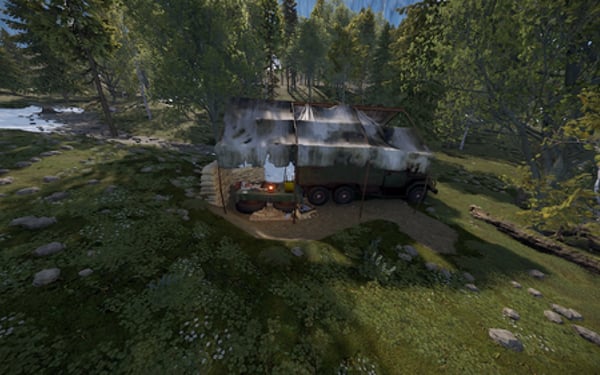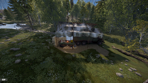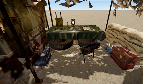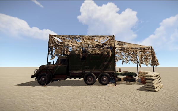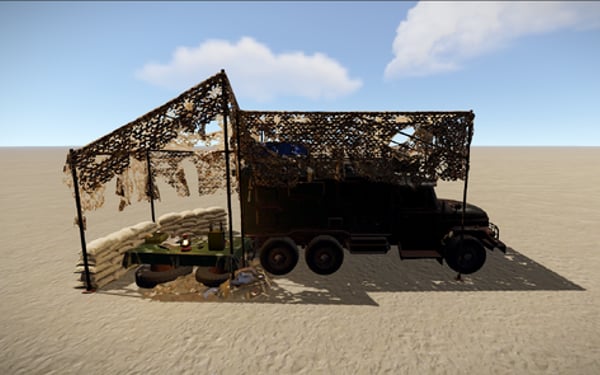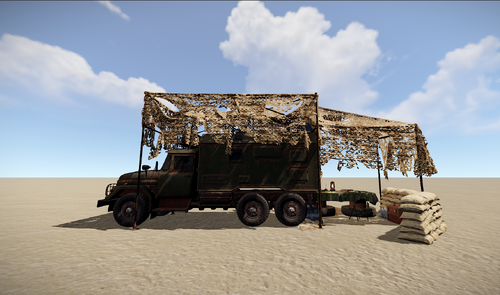 This is a small mobile camp with a truck covered with an awning. It has 2 crates, with tools and food. The pack has 2 camo options, neutral and desert.
