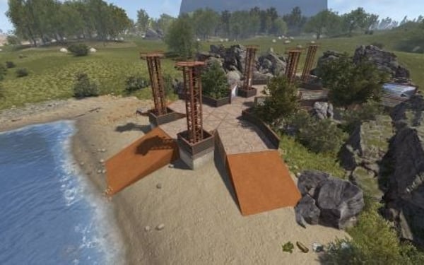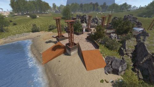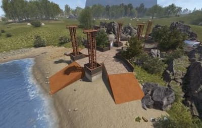 Both of these lead down to a 3 separate ramps in different directions. The lobby is also surrounded by some rock formations, small trees and some light towers for illumination.