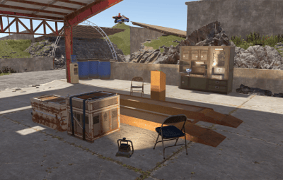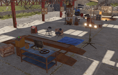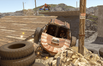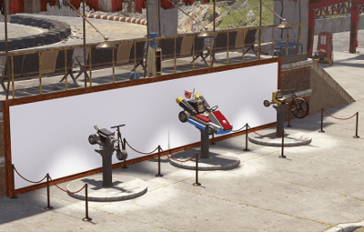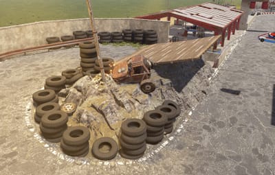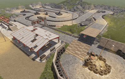 Also has a small Garage area, a raised seating area for spectators, some custom vehicles on display stands and surrounding rocks to assist blending into your maps!