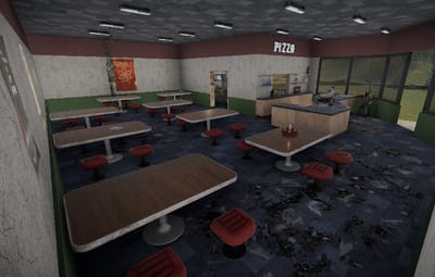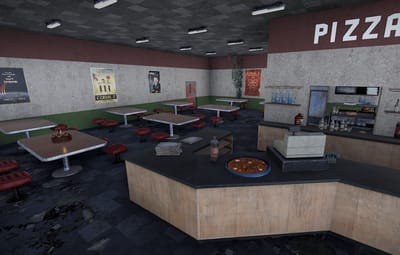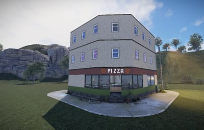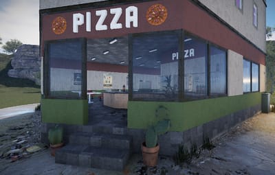 The pizzeria should not be missing in the city center. The Rowhouse was built to be attached to other houses. There is no loot inside. You can easily insert this yourself if you wish. This prefab was designed with great attention to detail. The top two floors cannot be entered, they are only for show. The pizza shop is a good meeting place for role-playing games.
