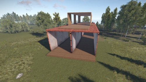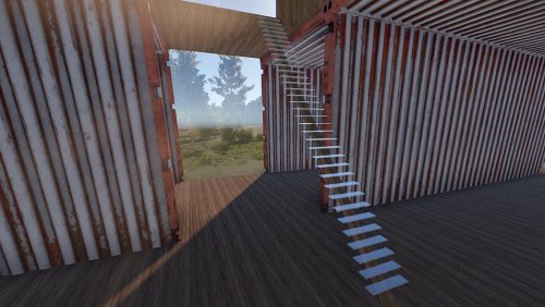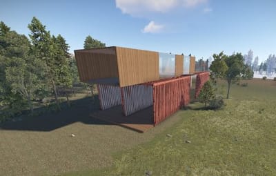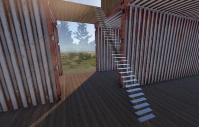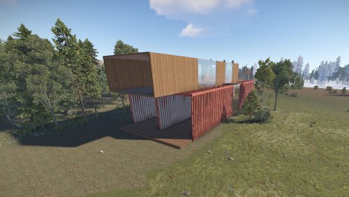 This base consists of two oversized shipping containers and a wooden house part connected with a long glass staircase.