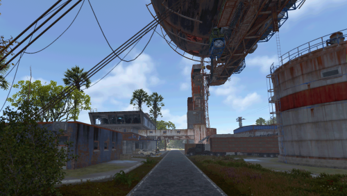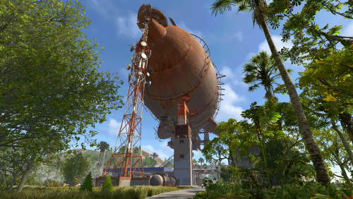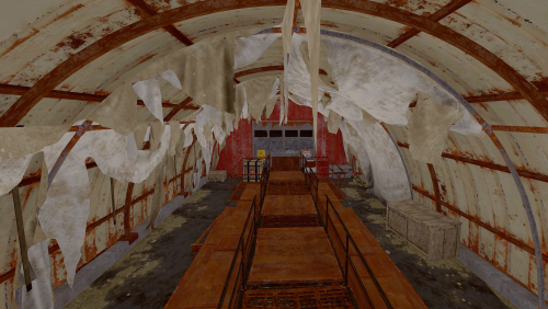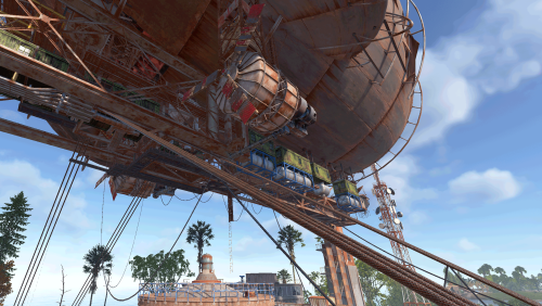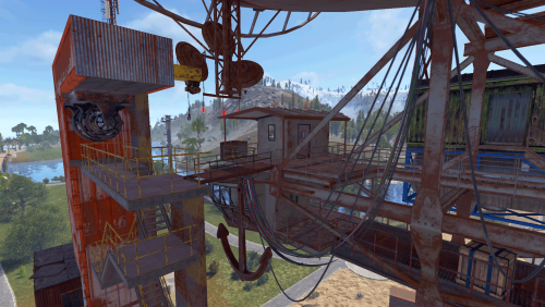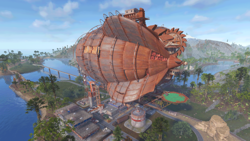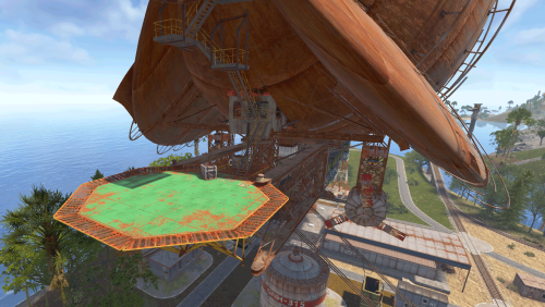 An iron skyship parked above its ground-based Skyport. Features authentic places to explore; main terminal building and outer support areas. 3 points of access to the skyship above. Crew cabins aboard to check. Climb over the high arched top or go inside the core structure from the aft landing pad. Monument has low-tier loot throughout leaving plenty of space to add your own NPCs, puzzles and hi-end loot.