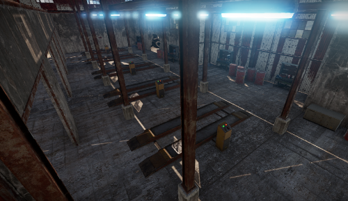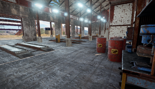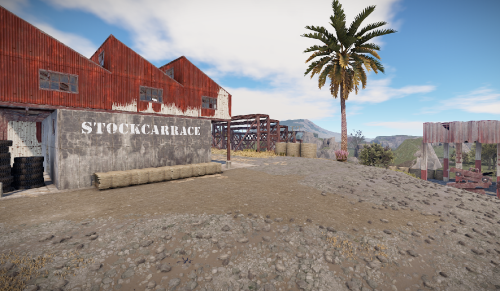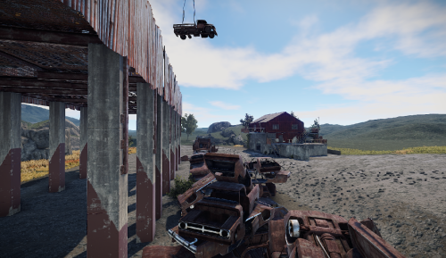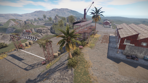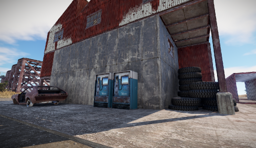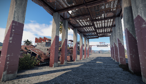 Let the race begin! This facility is really fun. Players can compete against each other in teams. Everyone throws some scrap into a box, the winner then gets the whole loot. There are barrels scattered around and two vending machines bring the components for the vehicles. There are cars on the road, or why not bring your own car from home?