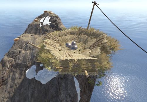 Stonehand is a dramatic rock formation shaped like an enormous stone hand: four narrow spires with a fifth off to the side, resembling fingers and a thumb. Huge abandoned nests perch atop the “fingers” (climbing into one grants 100% comfort — the perfect spot to rest). Tool marks and scattered debris hint at a colossal but unfinished sculpting project long since deserted.