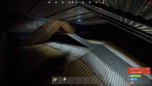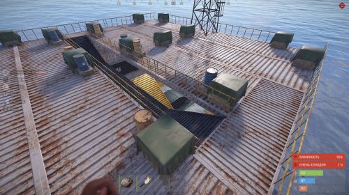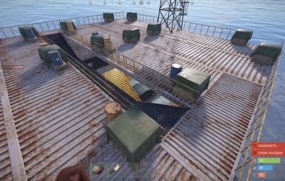 A platform with an underwater section, fully available for building. There are no construction restrictions on the prefab. On the top, there are barrels with loot. At the bottom, there is a recycler, a CCTV station, and two code-locked crates.